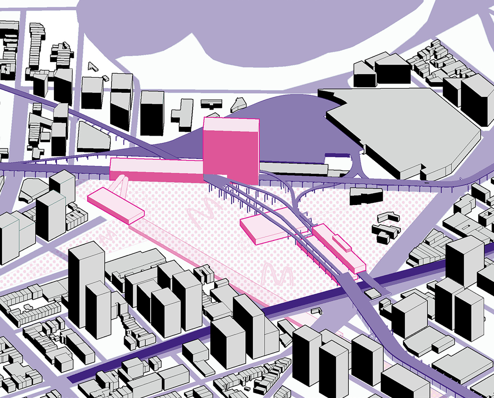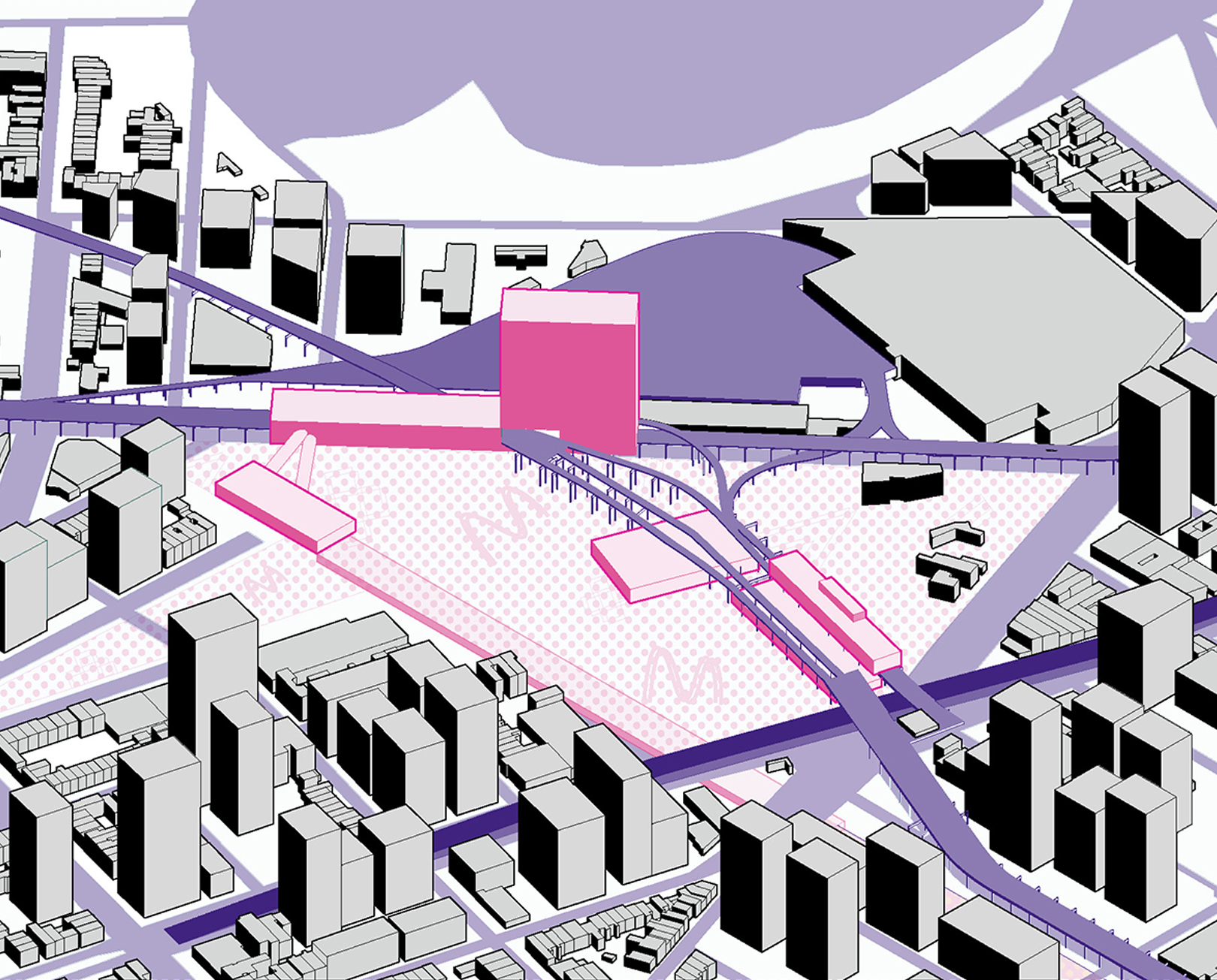 The project situates itself in this negotiation; between a city which is continuing to expand and a neighborhood wanting to maintain its identity. Through a careful investigation of the conditions of the site, a few key contextual relationships were identified to build on; a lack of pedestrian access between various transit modes acting on site, a lack of public spaces and social infrastructures for the current and future populations of this neighborhood, and an opportunity to connect stakeholders to new spaces on the site through the use of existing infrastructure.