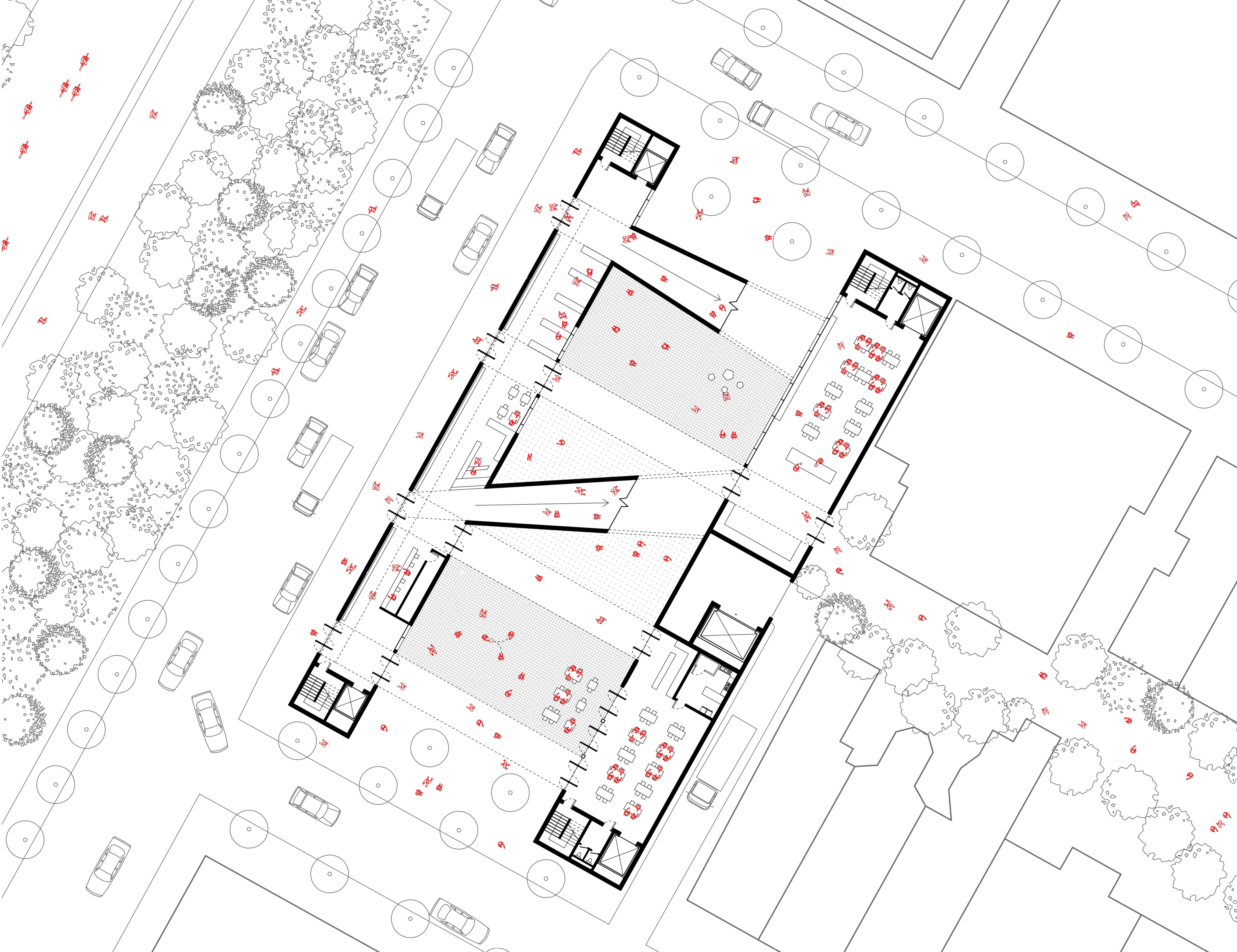 Two buildings sit facing each other, 22 meters apart, as nine ramps stretch and expand across. The ramps open up on the front facade that serve as modular windows of Central Park. Although the museum has classic elements of marked territory, the building has no “main” entrance, subverting the typical characteristics of demarcation; visitors can enter through the courtyard or rear building. Emblematic of the overall design, there is little emphasis on hierarchy in order to equalize the experience. Once inside on the ground floor, visitors have the option of ascending the ramps through two different pathways, which interchange and connect through the eight stories. A visitor going up can have a completely different experience going down. In keeping with radical artist culture, we request this museum have no entry fee; as public space, this building will not become a commodity to be profited on.